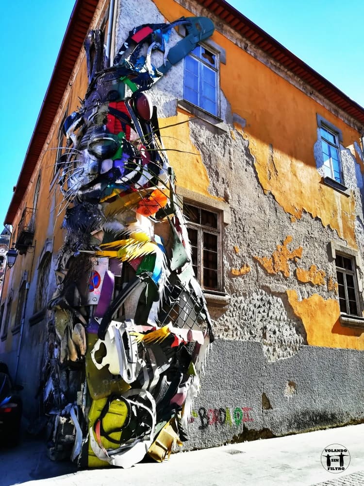 Gaia es uno de nuestros sitios favoritos de toda esta ruta, ahora para llegar hasta la parte de abajo vas a tener que recorrer sus pequeñas callejuelas. El siguiente punto es la escultura de arte callejero Half Rabbit del artista Bordalo II, se trata de un conejo hecho con basura y materiales reciclados para reivindicar la sostenibilidad ecológica.