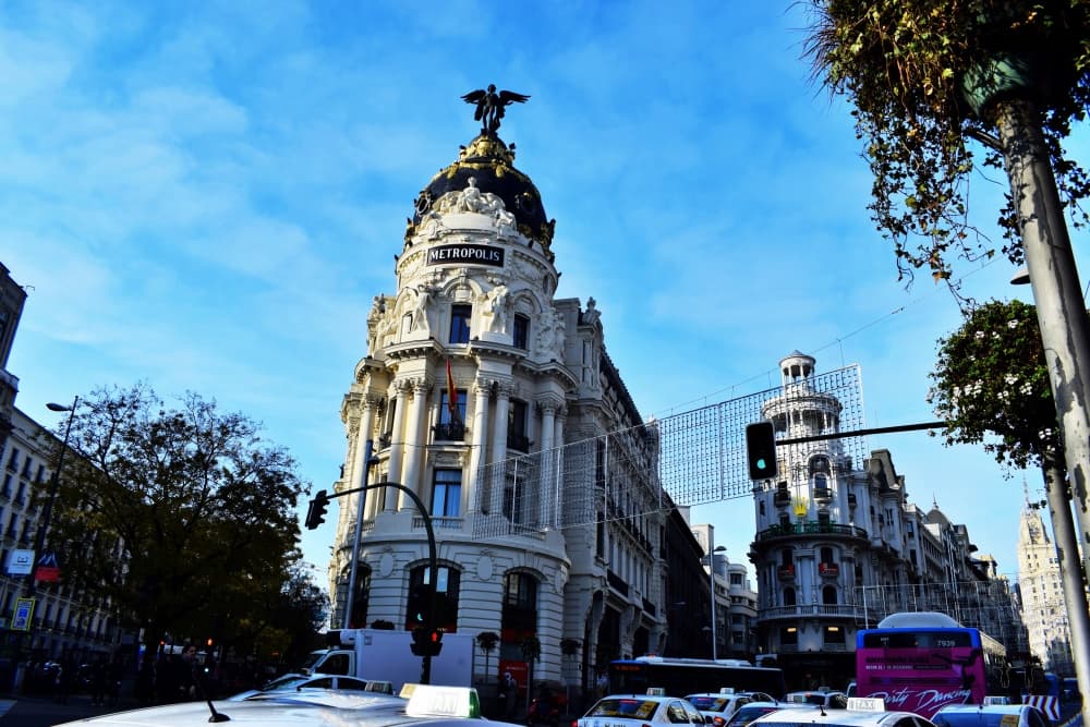 Es el edificio más fotografiado de Madrid y no nos extraña nada, a nosotros nos encanta. Se construyó entre 1907 y 1911, actualmente es propiedad de la aseguradora Metrópolis, que es de donde viene su nombre. La cúpula está adornada con más de 30 000 panes de oro de 34 quilates, quizás por eso llame tanto la atención.
