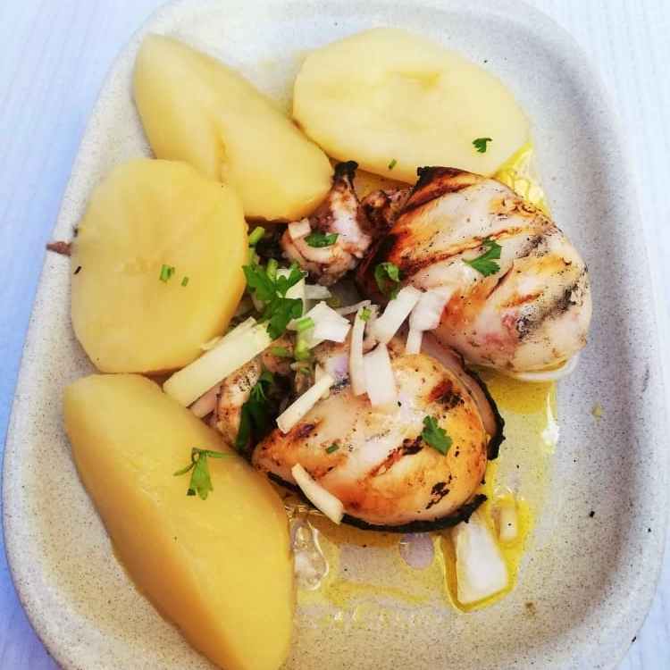 Probamos dos platos del día: choco a la brasa, con mucho sabor y en su punto; y costilleta de ternera, nada seca y acompañada de patatas fritas caseras.