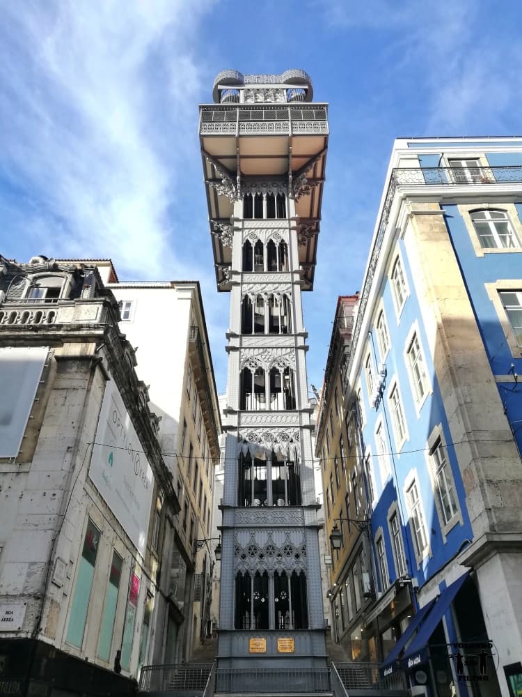 Tiene una altura de 45 metros y subir en él se ha convertido en algo muy turístico. Conecta la Baixa con Chiado y el precio del trayecto es de 5,30 € ida y vuelta, si esto te parece un poco caro puedes optar a ir al mirador de la parte de arriba por solo 1,50 €.
