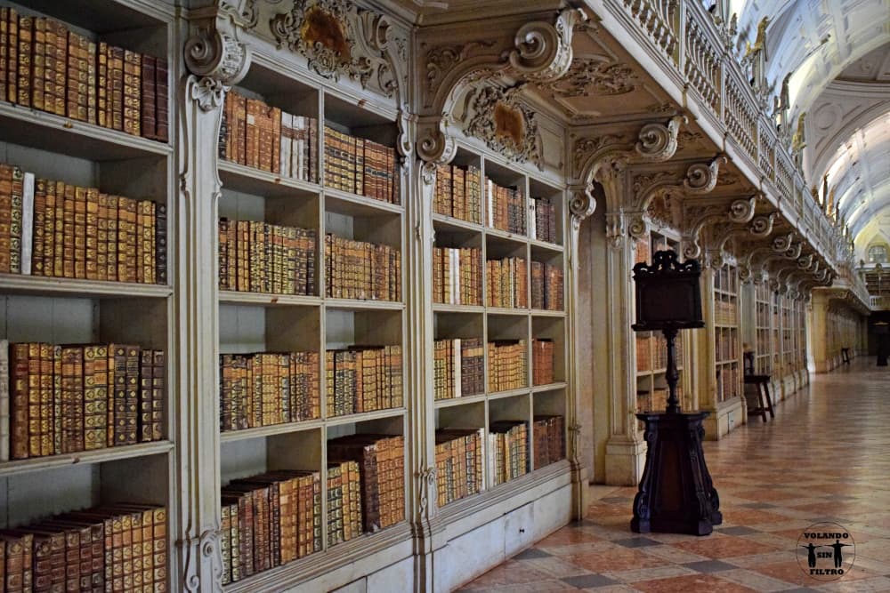 El Palacio Nacional de Mafra está muy cerca de Lisboa, nosotros paramos antes de llegar a la ciudad. Es el monumento más importante del estilo barroco portugués y fue construido en el siglo XVIII. Para verlo y entrar tienes que pagar una entrada de 6 €, vas haciendo un recorrido por diferentes salas en las que tienes algunos carteles explicativos de lo que vas viendo. Para nosotros la entrada no merecía la pena hasta que llegamos a la Biblioteca, tiene más de 40 000 ejemplares y nos dejó totalmente enamorados. La visita merece la pena solo por ver esta salsa.