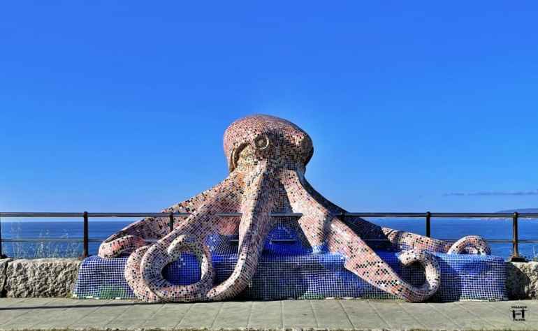 Este pulpo es uno de los puntos más queridos de todo el Paseo Marítimo, no te creas que es pequeño, mide 2 metros de alto por 3 de ancho y está compuesto de pequeñas piezas de cerámica que cambian de tono según la luz que haya. Fue inaugurada en el año 2004 y es obra del coruñés Javier M. Padín Martínez.