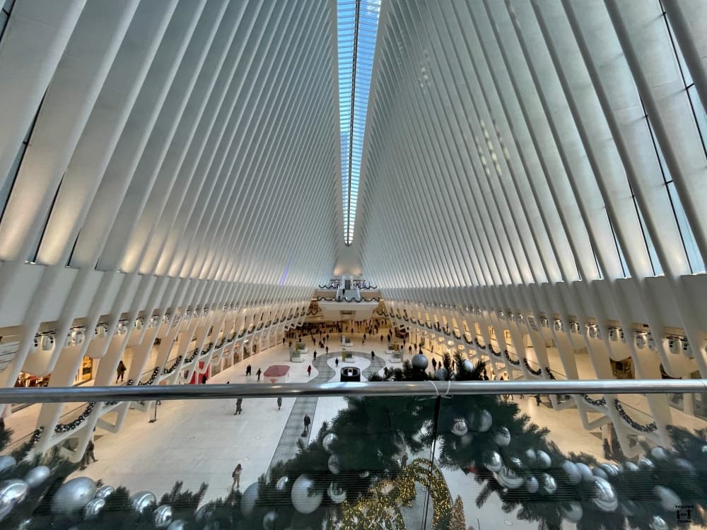 Es una obra del arquitecto español Santiago Calatrava. Se construyó después de los atentados del 11S, ya que las autoridades necesitaban que la zona necesitaba volviese a tener edificios. El creador quiso que la forma del edificio representase una paloma alzando el vuelo. Por dentro es una superficie comercial con un montón de tiendas: Apple, Pandora… Pensamos que no nos iba a gustar, pero nos encantó, aunque es muy diferente a los edificios que le rodean creemos que está en total sintonía con la ciudad.