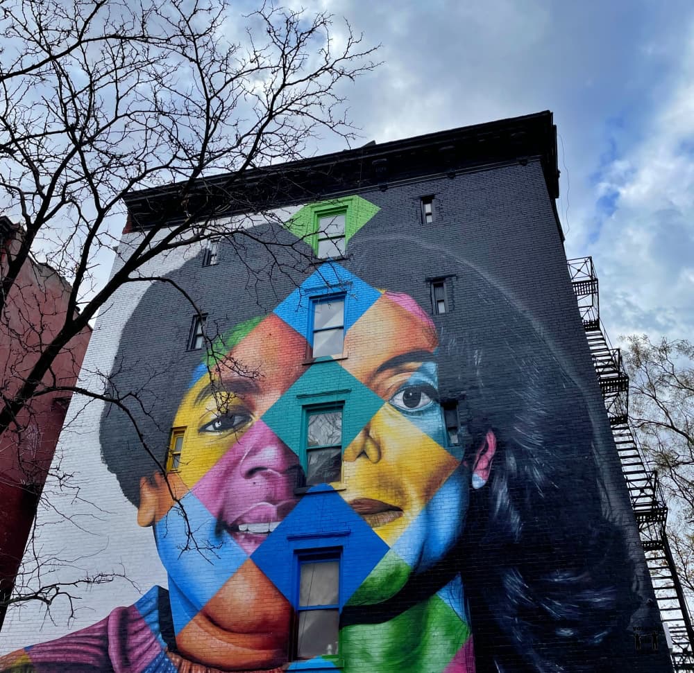 El artista de Brasil tiene muchísimas obras por Nueva York, pero esta es una de las más conocidas. En ella se puede ver a Michael Jackson de niño y de adulto. Pero no te quedes solo en el grafiti de Kobra, justo al cruzar la calle hay una pared que nos encantó y que de hecho es la portada de este post.