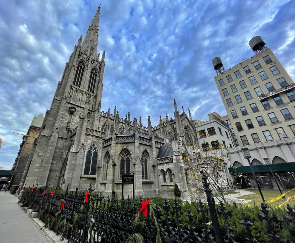 ¡Qué iglesia más bonita! Si hablamos de Nueva York siempre hay algo curioso que contar. Esta iglesia antes estaba ubicada en pleno Downtown, pero cuando Manhattan empezó a crecer hacia el norte, se decidió trasladar en 1843 hasta el punto donde la podemos ver hoy en día. ¿Te imaginas la logística de trasladar un edificio tan grande? La verdad es que la fachada nos pareció una pasada, somos muy fans de este tipo de edificios y este nos cautivó.
