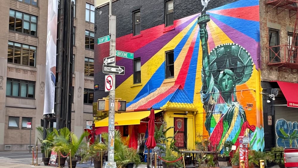 Kobra es un artista de Brasil famoso por sus coloridos murales y por los mensajes de los mismos. En tu ruta andando por el SoHo puedes ver el de la Estatua de la Libertad, si te gusta el arte callejero no te puedes perder este lugar.