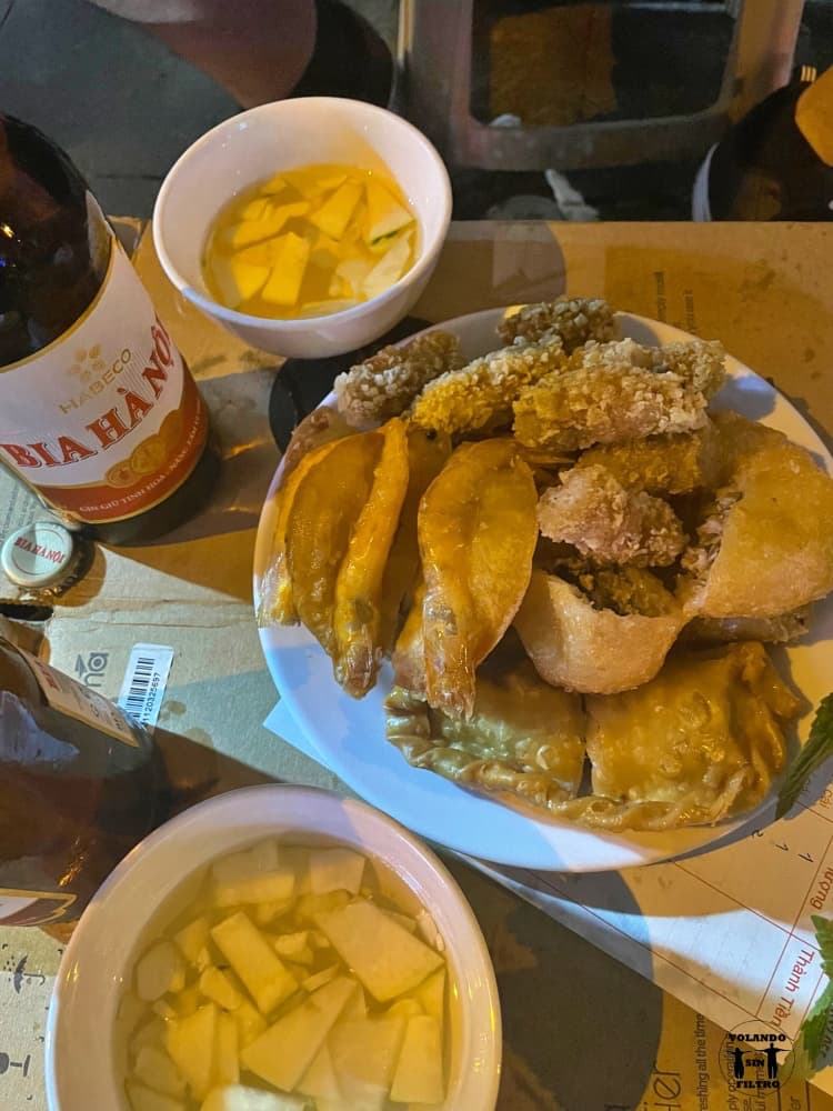 ¡Nuestro «restaurante favorito de Hanoi»! Este sitio nos encantó, se trata de un local que solo sirve frituras, pero no son fritos cualquiera, son cosas típicas del país y están todas buenísimas. Probamos un montón de cosas y no hubo ni una sola que no nos gustase. El trato fue muy bueno, el señor que atiende las mesas nos encantó, si necesita más porque hay gente esperando, pone dos cajas con dos taburetes y listo.