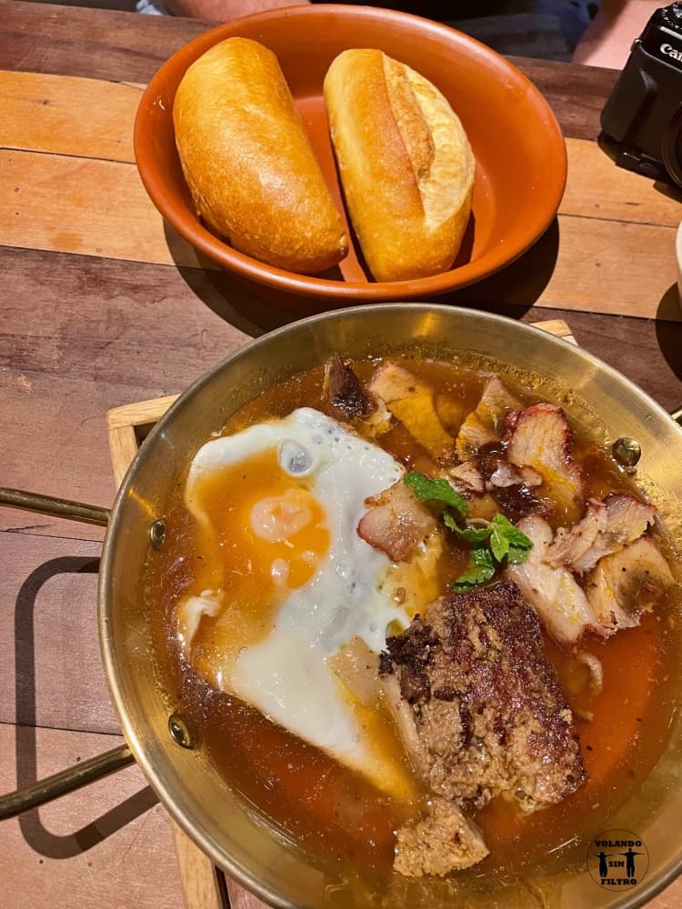 Si eliges nuestra alternativa te traerán una sartén de lo que decidas, en nuestro caso de cerdo, con diferentes preparaciones de carne y con huevo (si quieres), todo esto acompañado de dos panes para que vayas mojando y haciéndote tus propios «montaditos». La verdad es que estaba buenísimo y para cenar 2 una sartén llega perfectamente. ¡Un sitio muy recomendable!