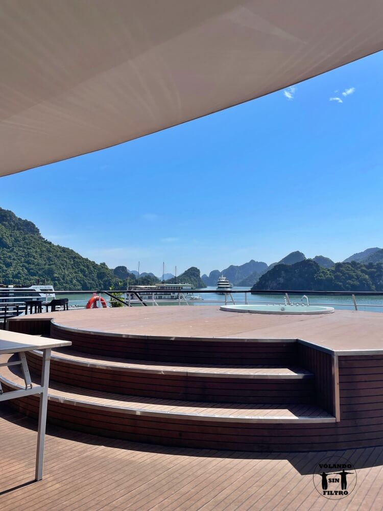 El barco nos sorprendió mucho, estaba muy cuidado y nos podíamos mover por él con bastante libertad. En el caso de nuestro crucero no tenía zona de tumbonas en la cubierta pero si lugares en los que poder relajarse y sentarse. Además, de un jacuzzi en la cubierta superior para poder darse un baño disfrutando de las vistas.