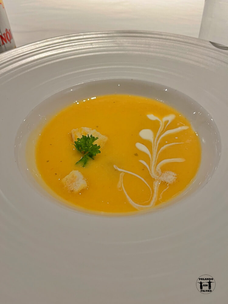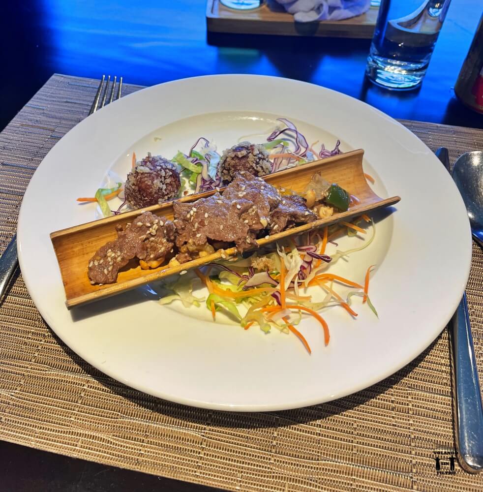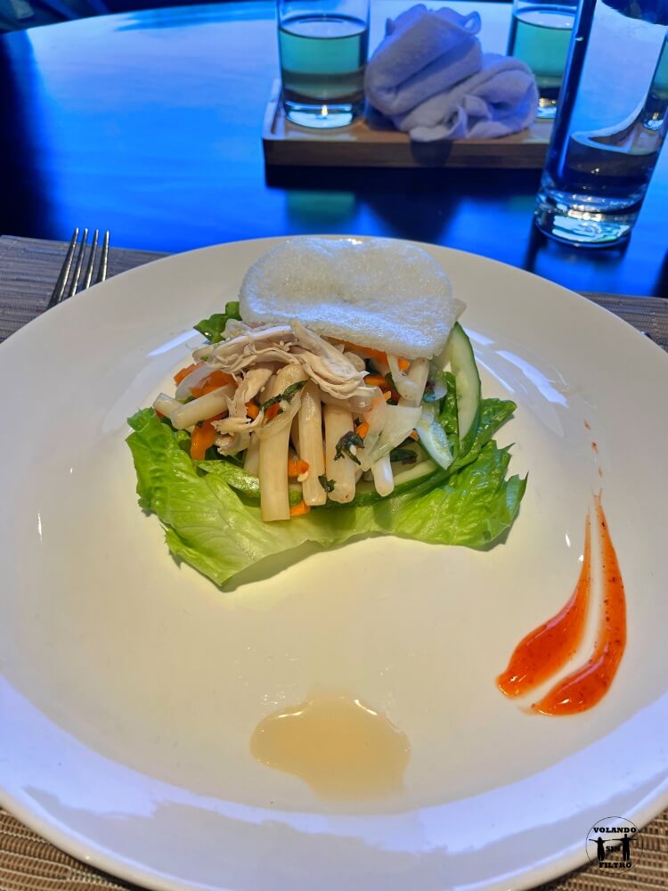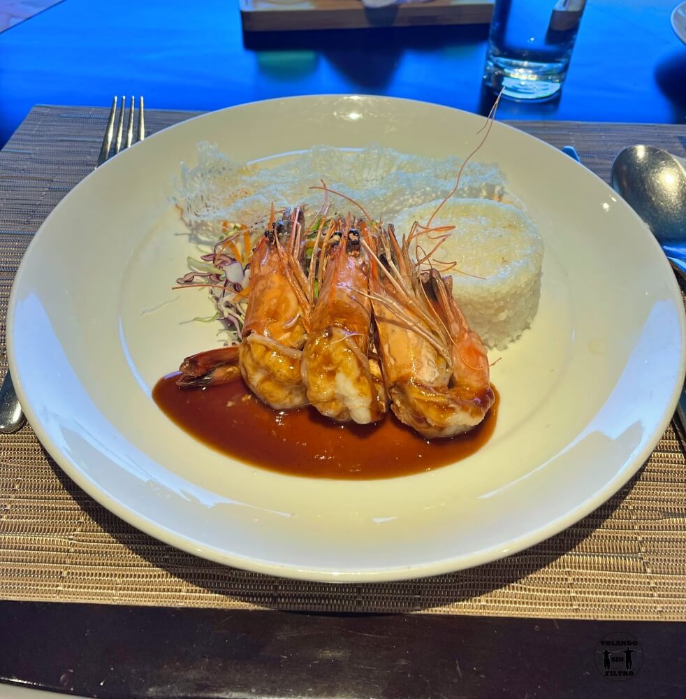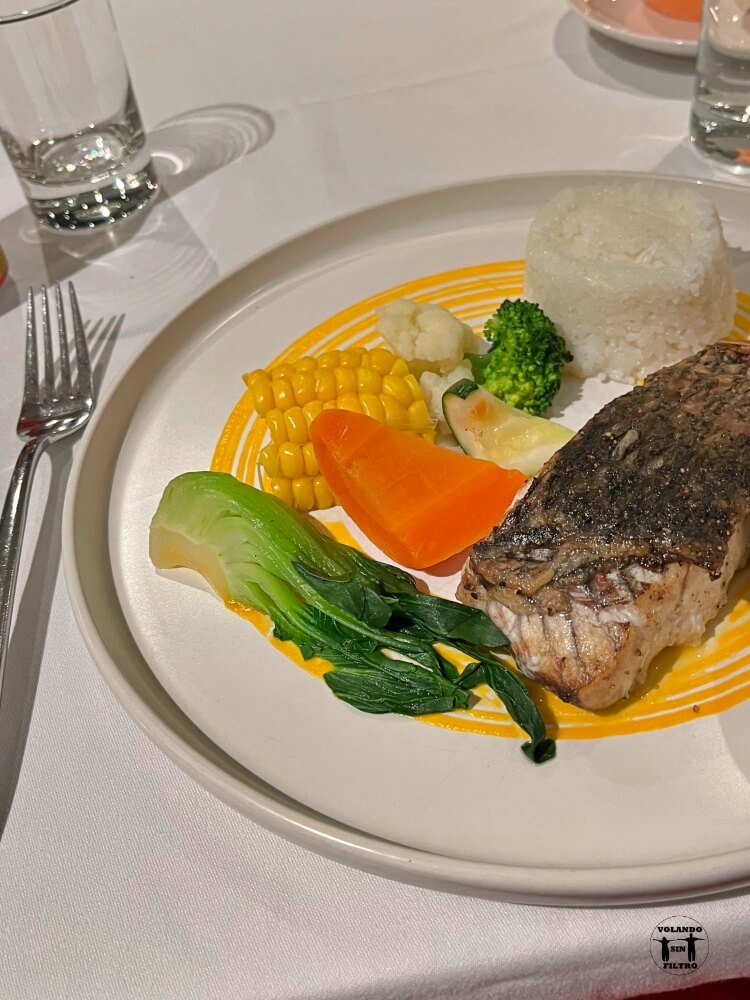 La comida fue el gran chasco que nos llevamos. ¿Por qué? Porque en Scarlet venden su experiencia gastronómica como algo superior y fue una de las razones por las que nos decidimos por este barco. En el caso de la primera comida no estuvo nada mal, todo estaba rico y muy bien presentado, de hecho, nos sorprendió mucho la ternera en bambú.