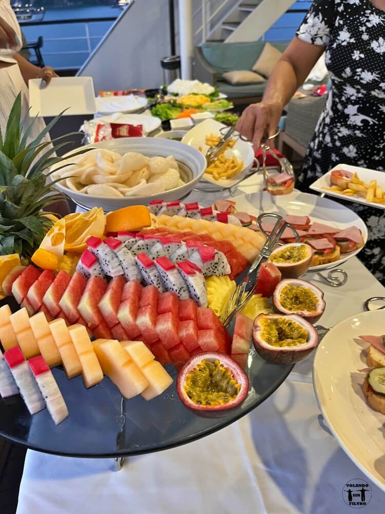 Por la mañana antes de las actividades hay un pequeño desayuno con cereales, algo de bollería, alguna opción salada… Está bien para tomar algo. Luego, antes de que te bajes del barco hay una comida un poco más sencilla en la que puedes comer pho, arroz frito y alguna que otra opción para que no tengas que comer nada al llegar.