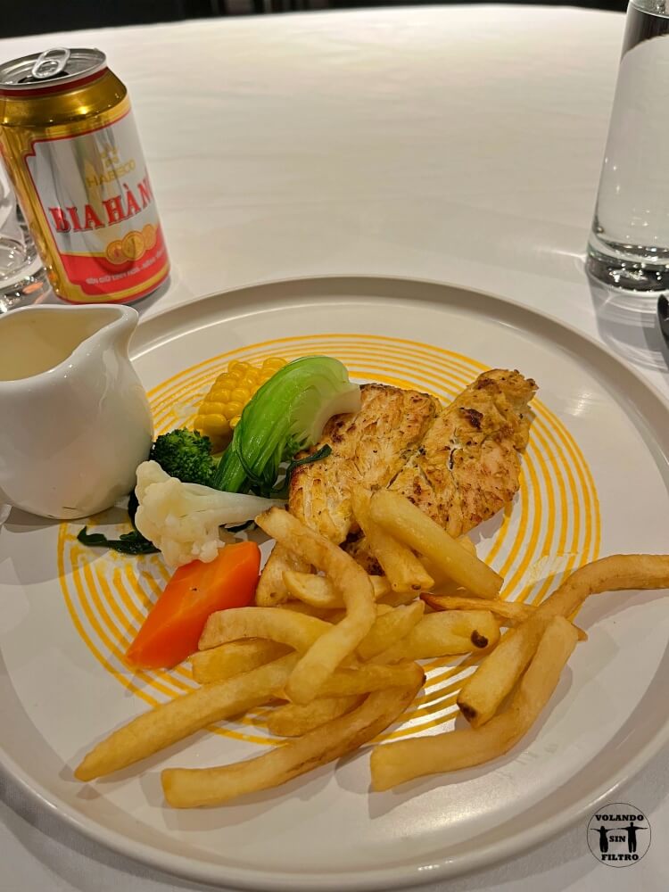El problema vino en la cena, que es cuando supuestamente íbamos a probar comida vietnamita de una forma más especial. Pues no, era mentira. Para cenar nos pusieron una especie de menú que parecía de «comedor de colegio». Una crema de verduras, pescado a la plancha con verduras hervidas y patatas fritas con pechuga de pollo. No te vamos a mentir, alucinamos bastante con la bajada de nivel de la comida a la cena.