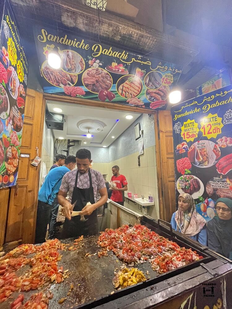 Esta calle nos la encontramos por casualidad porque teníamos que pasar por ella para ir a la plaza Jemaa El-Fna desde nuestro hotel. Tiene 4 o 5 puestos que hacen la misma elaboración: una especie de sándwich con muchas cosas.