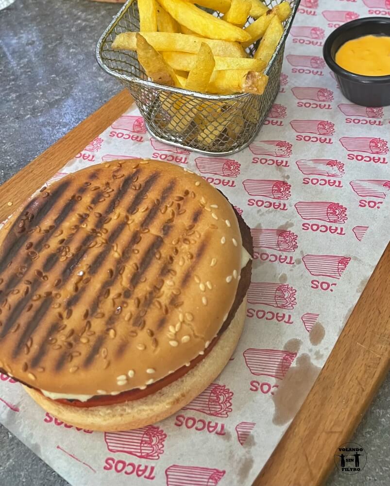 Pedimos una pizza margarita que estaba rica y traía también pimientos y aceitunas, no sabemos muy bien por qué y también una hamburguesa de pollo frito con patatas fritas que estaba sabrosa y nada seca. Para comer algo rápido y salir del paso, un sitio que esta muy bien.