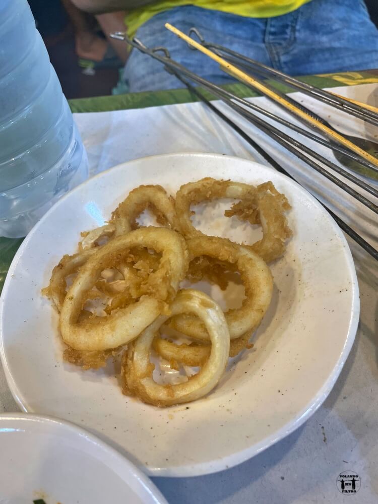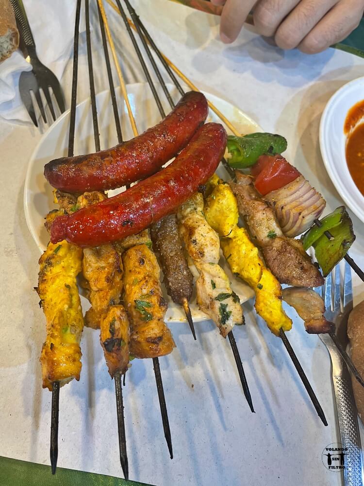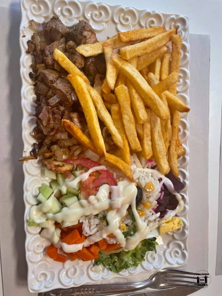 Pedimos brochetas mixtas para probar diferentes carnes y estaban buenísimas, de hecho, fueron los mejores pinchos que nos comimos en todo el viaje. Destacamos especialmente la ternera y las salchichas, pero en general todo estaba muy rico. También quisimos pedir unos calamares y para que mentir, no merecen la pena ni un poquito, no estaban bien fritos y el sabor no era nada especial. Con las brochetas y el pan que te ponen puedes vivir la experiencia de cenar en todo el meollo. La comida no nos sentó mal, no te dejes guiar solo por las opiniones generales de un lugar, a veces puede sorprender.