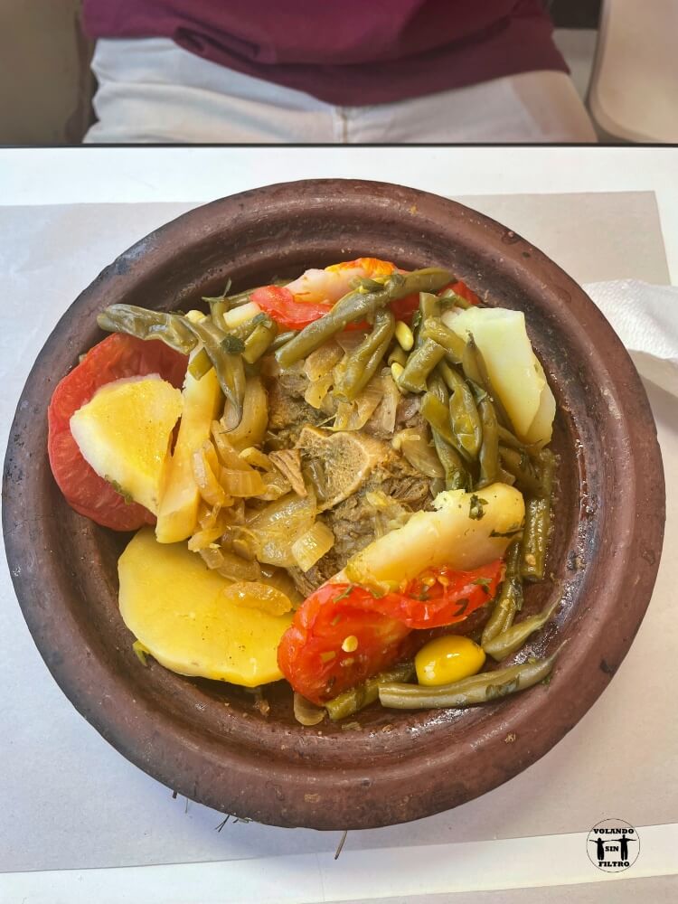 Hay todo tipo de platos marroquís: cuscús, tagines, pastelas, brochetas… En nuestro caso probamos un tagine de cordero que nos gustó mucho, la carne se deshacía con el tenedor y de cantidad estaba bien. También pedimos unas brochetas de ternera que estaban bien de sabor pero de textura un poco secas, eso sí, venían con patatas y una ensalada que estaba rica. Por el precio lo recomendamos al 100 %, es una manera de comer en la plaza de forma barata y ver el ambiente desde la terraza.